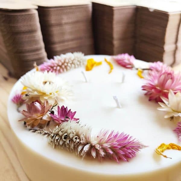 Cette bougie vegan de 800 ml est réalisée à base de cires végétales de soja et de colza puis décorée avec des fleurs et végétaux séchés de Célosie Flamingo (courage, force), d’immortelle (éternité) et de tournesol (prospérité, épanouissement). Cette gamme de bougies fleuries XXL redonne la parole aux fleurs en diffusant les messages positifs et bienveillants de ses compositions !